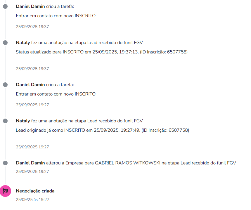 - Adiciona uma Anotação: Uma nova nota é adicionada ao histórico da negociação, informando: “Status atualizado para INSCRITO em dataehora.” Isso cria um registro claro da conversão do lead.