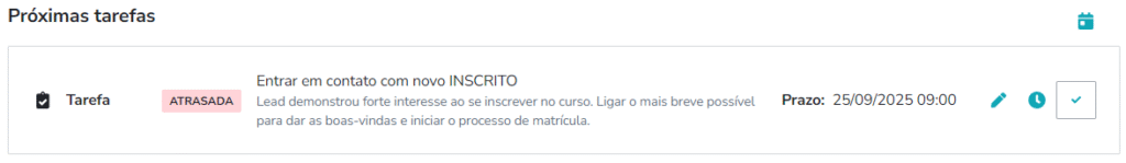 - Cria uma Tarefa para a Equipe: Uma tarefa é criada e atribuída automaticamente para o(a) vendedor(a) responsável, com o título “Entrar em contato com novo INSCRITO” e agendada para o mesmo dia.